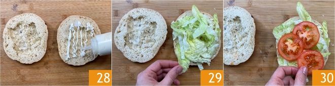 Giet nu de groenten af en dep ze droog, vervolgens ben je klaar om je kebab te assembleren: snijd de pita doormidden en bestrijk één helft met de yoghurtsaus 28, voeg dan de sla 29 en de tomaten 30 toe.