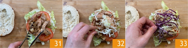 Ga verder met de reepjes vlees 31, de witte kool 32 en de rode kool 33.