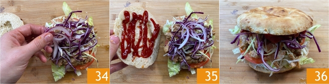 Maak af met de rode ui 34, sluit daarna af met de andere helft van het broodje besmeerd met ketchup 35. Ga op dezelfde manier te werk om ook alle andere broodjes te vullen. Je zelfgemaakte kebab is klaar om van te genieten 36!