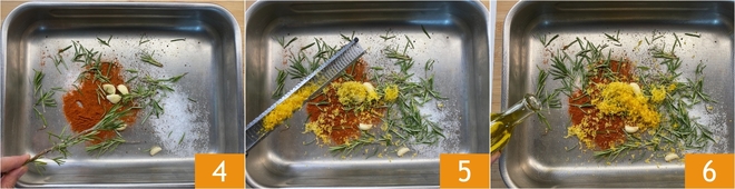 Voeg de rozemarijnnaalden 4, de geraspte schil van de citroenen 5 en de olie 6 toe.
