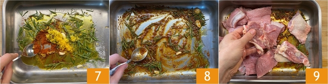 Voeg ook het komijn- en korianderpoeder toe 7, meng alles 8 en leg de plakjes kip en kalfsvlees erin 9.