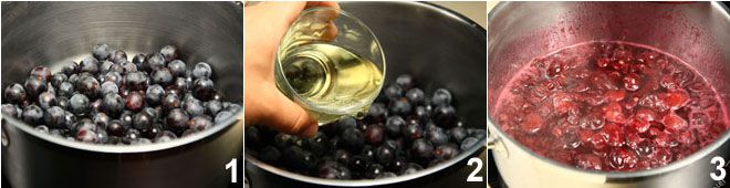 Om de aardbeien druiven- en kaneelconfituur te bereiden, begin je met het steriliseren van de potten en deksels zoals aangegeven in de richtlijnen van het Ministerie van Volksgezondheid onderaan het recept. Nadat je deze handeling hebt uitgevoerd, was je de druiven en verwijder je de druiven van de tros 1, plaats ze in een grote pan en voeg de witte wijn toe 2. Kook ze op hoog vuur gedurende ongeveer vijftien minuten totdat de druiven gedeeltelijk zijn fijngeprakt 3.