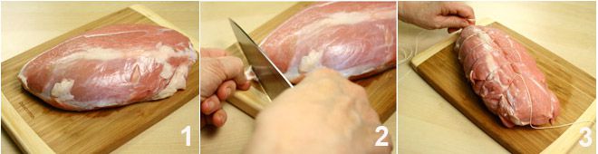 Neem uw kalfsnoot en leg deze op een snijplank 1; verwijder met een mes eventuele kraakbeen 2, en bind het vervolgens vast met een keukentouw 3.