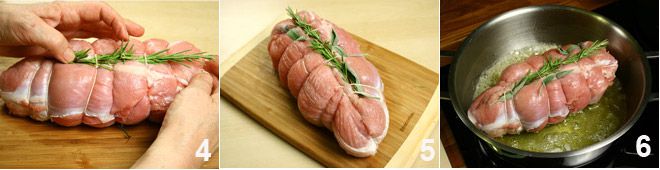Leg de rozemarijn en enkele salieblaadjes op uw gebraad (4-5). Neem een pan en verwarm hierin de olie en de boter, voeg daarna het vlees toe 6.