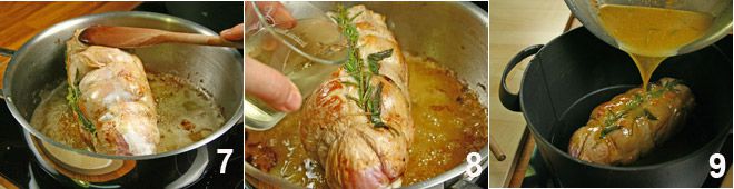 Bak het gebraad aan alle kanten bruin, draaiend met een houten lepel 7, voeg dan de wijn toe 8. Wanneer het gebraad goed bruin is, plaats het in een ovenvorm, waar u ook de bakjus aan toevoegt 9.