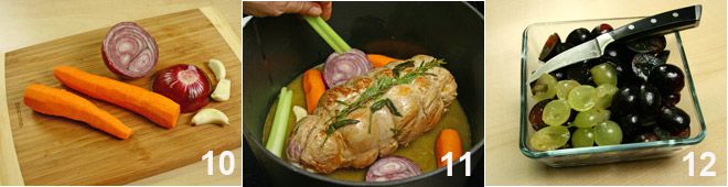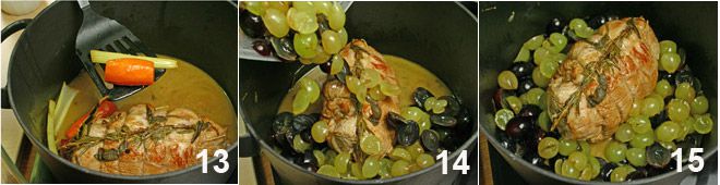 Na een uur bakken, verwijdert u de groenten en de kruiden uit de pan, en laat u alleen de bakjus achter 13, voeg dan de druiven toe (14-15) en bak nog 20 minuten op 180°. Laat, zodra de oven uitstaat, het gebraad enkele minuten rusten, snijd het daarna in plakken en serveer samen met de druiven, voeg de gevormde jus tijdens het bakken toe.