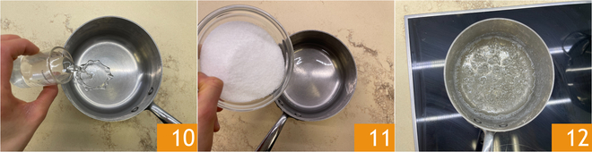Intussen week je de gelatine voor de mascarponecrème en maak je de pâte à bombe: doe in een klein steelpannetje water 10 en suiker 11. Zet op het vuur en houd met een suikerthermometer de temperatuur in de gaten; het moet 121°C bereiken 12.