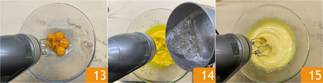 Als het suikersiroop 115°C bereikt, begin je in een aparte kom de eidooiers te kloppen 13 en giet je het hete mengsel van 121°C langzaam bij de dooiers terwijl je blijft mixen 14. Blijf kloppen totdat het mengsel op kamertemperatuur is gekomen; dit duurt ongeveer 15 minuten. Als het nog wat vloeibaar lijkt, geen zorgen 15.