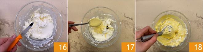 Zet de mascarpone in een kom, breng op smaak met het merg van het vanillestokje 16 en voeg de pâte à bombe toe 17. Meng het geheel voorzichtig met de garde 18.