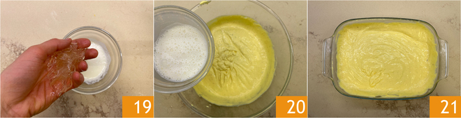Voeg tenslotte de gelatine, uitgeknepen, toe in een kommetje met warme slagroom 19. Roer tot de gelatine volledig is opgelost en voeg het mengsel toe aan de mascarponecrème 20. Doe de verkregen crème in een kom 21, dek af met vershoudfolie direct op het oppervlak en laat 30 minuten opstijven in de koelkast. Voor het gemak kun je een spuitzak zonder spuitmondje gebruiken.