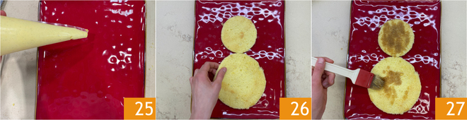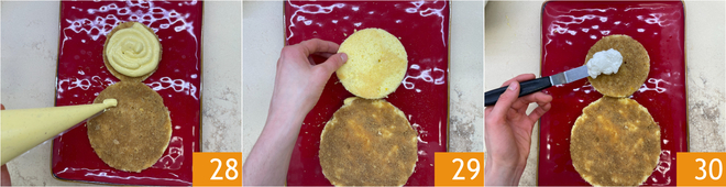 Spuit op het serveerschaal wat toefjes crème zodat de pan di Spagna goed blijft zitten 25. Leg de eerste twee schijven neer, de kleinere bovenop en de grotere onderop 26. Besprenkel beide oppervlakken met koude koffie 27.