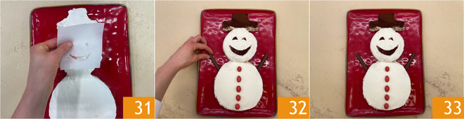 Maak een sjabloon van bakpapier door de vormen van de ogen en de mond uit te knippen, leg dit op de kleinere schijf 31 en bestuif met cacao. Bestuif ook de muts met cacao. Werk tenslotte af met chocoladeconfetti als knopen en 2 met chocolade bedekte koekjes als armen 32. Jullie Kersttiramisu is klaar om te serveren 33!