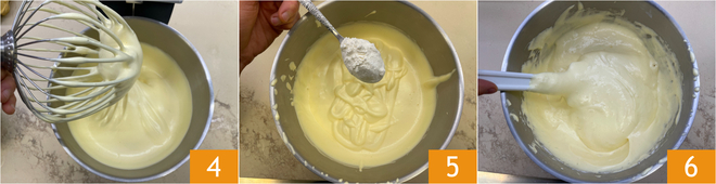Wanneer het mengsel verdrievoudigd is en 'schrijft' 4, voeg dan de tevoren gezeefde bloem en maïszetmeel toe 5. Spatel de droge ingrediënten voorzichtig door met een spatel, door van onder naar boven te vouwen 6.