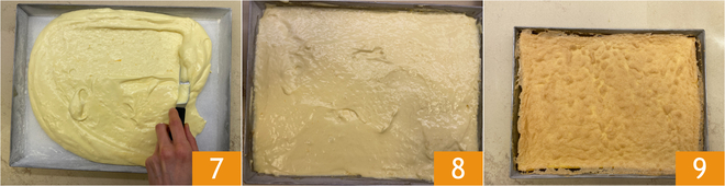Giet het beslag in een ingevette en bebloemde bakvorm van 30x40 cm en strijk het oppervlak glad met een spatel 7. Bak in een voorverwarmde conventionele oven op 160°C gedurende ongeveer 40 minuten 8. Wanneer de pan di Spagna goudbruin is, haal hem uit de oven en laat afkoelen 9.