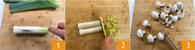 Om de kip in roomsaus te bereiden, begin je met de prei: verwijder de uiteinden, snijd vervolgens de eerste 2 lagen in en haal de buitenste bladeren weg 1. Halveer de prei en snijd hem in dunne ringetjes 2. Ga verder met de champignons: verwijder de modderige onderkant 3.