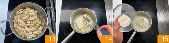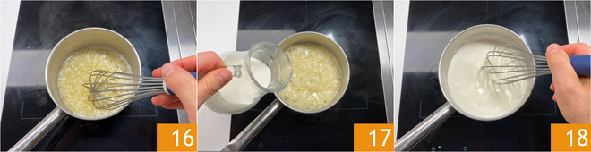 Meng snel met een garde totdat je een zachte roux krijgt 16, giet dan de hete room erbij 17 en blijf roeren totdat het licht begint in te dikken 18.