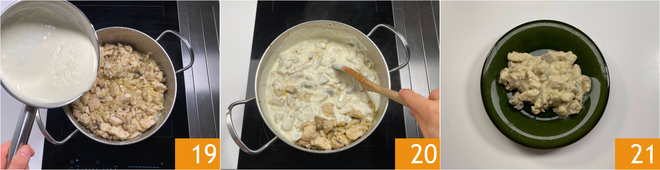 Voeg de béchamel bij de kip 19 en laat nog een paar minuten koken zodat alles goed samenkomt 20. Je kip in roomsaus is klaar, serveer het direct 21!