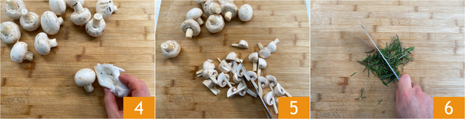 Wrijf de champignons voorzichtig schoon met een vochtig doekje om aarde te verwijderen 4, snijd ze daarna in vieren of in meerdere stukken, afhankelijk van de grootte 5. Hak tot slot de rozemarijn fijn 6.