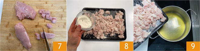 Maak de kipfilet schoon door eventuele botjes en kraakbeen te verwijderen, snijd hem vervolgens in blokjes van ongeveer 2 cm 7. Bestuif ze goed met bloem en schud het overtollige eraf 8 voordat je ze in een pan met een laag hete olie doet 9.