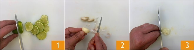 Om kip met limoen en munt te bereiden, was eerst de limoen goed en snijd hem in plakjes 1. Pel vervolgens de knoflook 2 en snijd deze in plakjes 3.