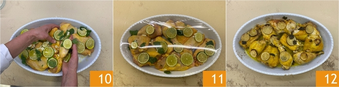 Meng met je handen 10 en dek af met vershoudfolie 11. Laat 30 minuten marineren in de koelkast. Bak vervolgens in een heteluchtoven, voorverwarmd op 180°C gedurende ongeveer 1 uur. Als het mooi goudbruin is, haal je de kip uit de oven 12.