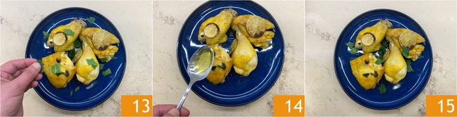 Het is tijd om op te dienen. Leg de kipstukken op een serveerschaal, voeg extra muntblaadjes toe en scheur ze met de hand 13, giet de braadsappen erover 14 en serveer 15.