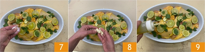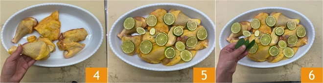 Leg de kipstukken in een ovenschaal 4, leg de limoenplakjes erop 5 en de muntblaadjes 6.