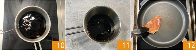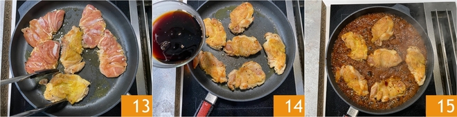 Houd het vuur middelhoog tot hoog en raak de kipbovendijen minstens 6-7 minuten niet aan, zodat er een mooi korstje ontstaat; draai ze daarna om 13 en bak nog eens 6-7 minuten aan de andere kant. Giet na deze tijd de teriyakisaus erbij 14, zet het vuur laag tot middellaag en schep de kipbovendijen om in de pan tijdens de laatste 5 minuten van de garing 15.
