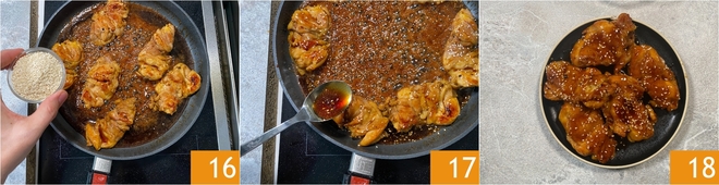 Voeg nu de sesamzaadjes toe 16 en bedruip de kip met het braadvocht om hem sappig te houden 17. Je teriyaki-kip is klaar om heet geserveerd te worden 18!
