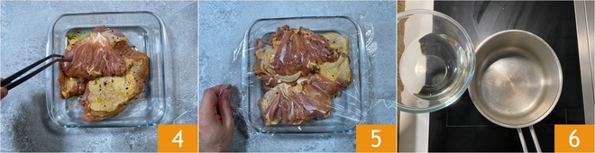 Meng de kip zodat het vlees gelijkmatig op smaak komt 4. Dek af met huishoudfolie 5 en zet even opzij. Maak ondertussen de saus: giet de mirin in een steelpannetje 6.