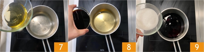 Voeg de sake 7, de sojasaus 8 en de suiker 9 toe.