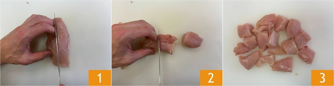 Om de kipfilet gepaneerd met grissini te maken, snijd je de kipfilet eerst in repen 1 en daarna in blokjes van ongeveer 3 cm 2 3.