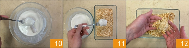 Laat overtollig beslag eraf lopen door de kip met een vork op te nemen 10 en leg hem vervolgens in de grissini-paneerlaag 11. Gebruik je handen om de kip volledig te bedekken 12.