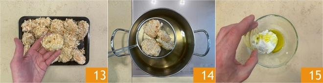 Ga zo door tot alle stukjes kip gepaneerd zijn 13. Verhit de olie tot een temperatuur van 170 b0-180 b0 en bak per keer slechts een paar stukjes zodat de olietemperatuur niet te veel daalt. Draai ze af en toe tot ze mooi goudbruin zijn; dit duurt ongeveer 8-10 minuten, afhankelijk van de grootte. Maak ondertussen de dipsaus: doe in een kom de Griekse yoghurt en de olie 15.