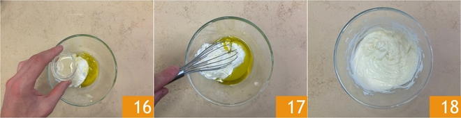 Voeg een snufje zout en het citroensap toe 16 en klop met een garde 17 tot een glad en dik romig mengsel 18. Doe het daarna in een serveerschaaltje.