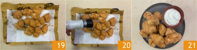 Als de kip gaar en mooi goudbruin is, laat hem uitlekken op een schaal bekleed met frituurpapier 19. Breng op smaak met zout 20 en serveer de kipfilet gepaneerd met grissini direct met de yoghurtsaus 21!