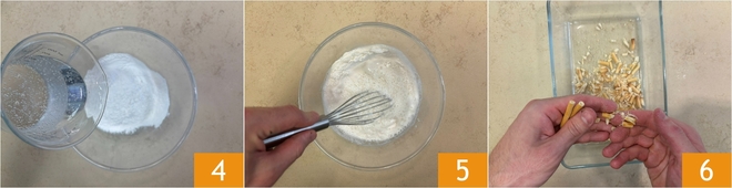Ga verder met het beslag: doe in een kom het rijstmeel en het koude bruisende water 4. Meng goed met een garde 5 tot een klontvrij beslag. Neem nu de grissini en verkruimel ze met de hand 6.