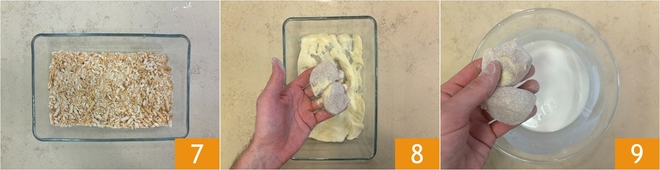 Je moet een grove paneerlaag krijgen 7. Haal de kip eerst door de griesmeel 8 en daarna door het beslag 9.