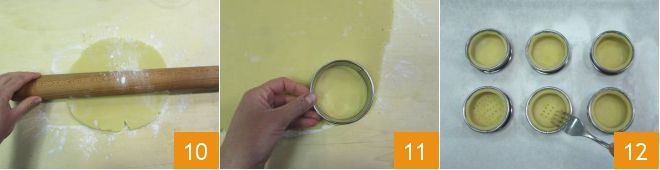 Haal het deeg uit de koelkast en rol het uit tot ongeveer 5 mm dikte 10, steek vervolgens cirkels uit met een steker van 6 cm diameter 11. Bekleed vormpjes van dezelfde diameter met het deeg en prik de bodem in met de tanden van een vork 9. Bak in een voorverwarmde heteluchtoven op 170°C gedurende 15 minuten.