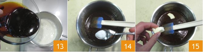 Maak ondertussen de gezouten karamel: giet de room in een steelpannetje en breng aan de kook, voeg daarna de karamel-topping toe 13, roer en wacht tot het weer kookt. Laat de karamel op middelhoog vuur inkoken gedurende ongeveer 3-4 minuten, zet dan het vuur uit en voeg het zout toe 14 en de boter 15. Roer goed door en zet even apart.