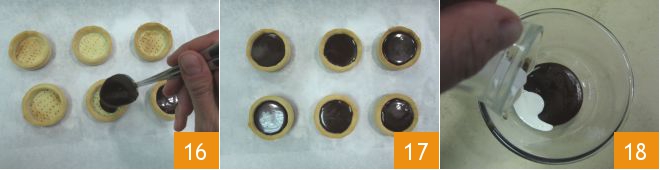 Als de taartjes gaar zijn, haal je ze uit de oven en laat je ze afkoelen. Zodra de zanddeegbakjes afgekoeld zijn, vul je ze met de gezouten karamel 16, houd hierbij een eetlepel karamel apart. Zet de gevulde taartjes nog minstens 30 minuten in de koelkast om op te stijven 17. Verdun intussen de overgebleven karamel met 30 g vloeibare room 18 en roer goed zodat ze zich vermengen.