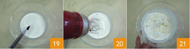 Maak tenslotte de opgeklopte room: giet de slagroom in een kom, voeg de zaadjes van het vanillestokje toe 19 en klop met de elektrische garde tot stijve pieken 20 tot je de gewenste consistentie hebt 21. Doe de opgeklopte room in een spuitzak met een stervormig spuitmondje van 12 mm.