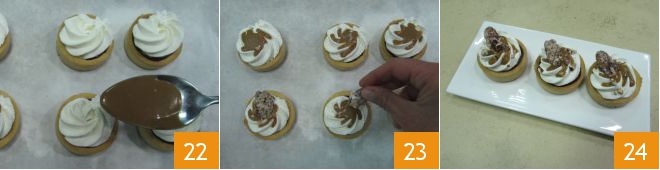 Na de koelperiode haal je de taartjes uit de koelkast en garneer je elk taartje met een toefje opgeklopte room, voeg daarna wat karamelsaus toe 22 en een pralinenoot 23. Je taartjes met gezouten karamel en gekaramelliseerde noten zijn klaar om geserveerd te worden 24!