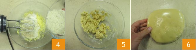 en de amandelmeel 4 en meng met de garde tot je een homogeen mengsel hebt 5. Leg het deeg op het werkblad en vorm een bolletje dat je in huishoudfolie wikkelt 6. Laat het minstens een uur rusten in de koelkast.