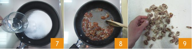 Neem ondertussen de gekaramelliseerde noten voor je: giet de suiker en het water in een anti-aanbakpan 7 en zet het vuur middellaag. Zodra de suiker volledig is opgelost, voeg je de pecannoten toe en roer je constant met een houten lepel 8 totdat de suiker gekristalliseerd is. Schep de praline-noten op een vel bakpapier en laat ze afkoelen, waarbij je ze met je handen van elkaar losmaakt 9.