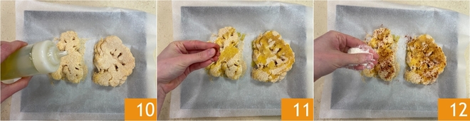 Besprenkel de gepaneerde plakken met een scheut extra vergine olijfolie 10 en werk af met een snuf paprikapoeder 11 en geraspte kaas 12.