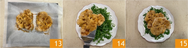 Bak in een voorverwarmde gewone oven op 1800C gedurende 30 minuten, zet daarna de grill aan op 2000C en ga nog 5 minuten door, totdat de koteletten goudbruin en krokant zijn 13. Serveer de bloemkoolkoteletten uit de oven goed warm, met verse rucola 14 15!