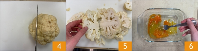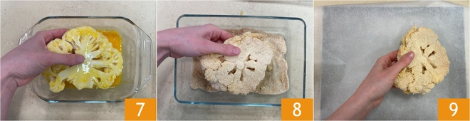 Haal de bloemkoolplakken eerst door het ei 7 en daarna door het paneermeel 8, zodat ze gelijkmatig bedekt zijn. Leg ze op een met bakpapier beklede bakplaat 9.