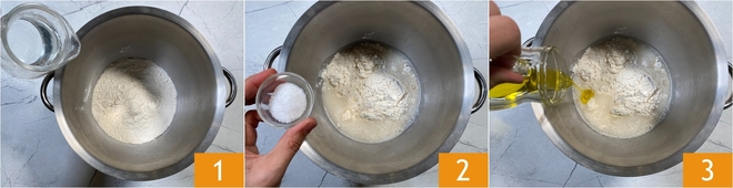 Om de krokante focaccia met pompoen en kaas te maken, begin je met het deeg: doe in de kom van een keukenmachine het water, de bloem 1, het zout 2 en de extra vergine olijfolie 3.