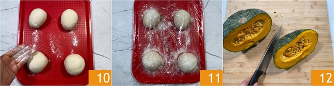 Leg de 4 deegstukken op een licht bebloemde schaal 10, dek af met plasticfolie 11 en laat 1 uur rusten in de koelkast 11. Maak intussen de pompoen klaar: snijd hem doormidden 12.
